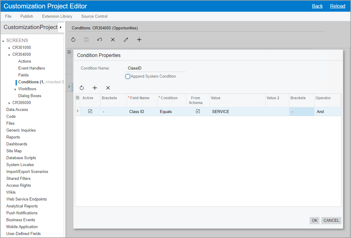 The following screenshot shows the Conditions page for the Opportunities (CR304000) form with the Condition Properties dialog box opened for the ClassID condition.
