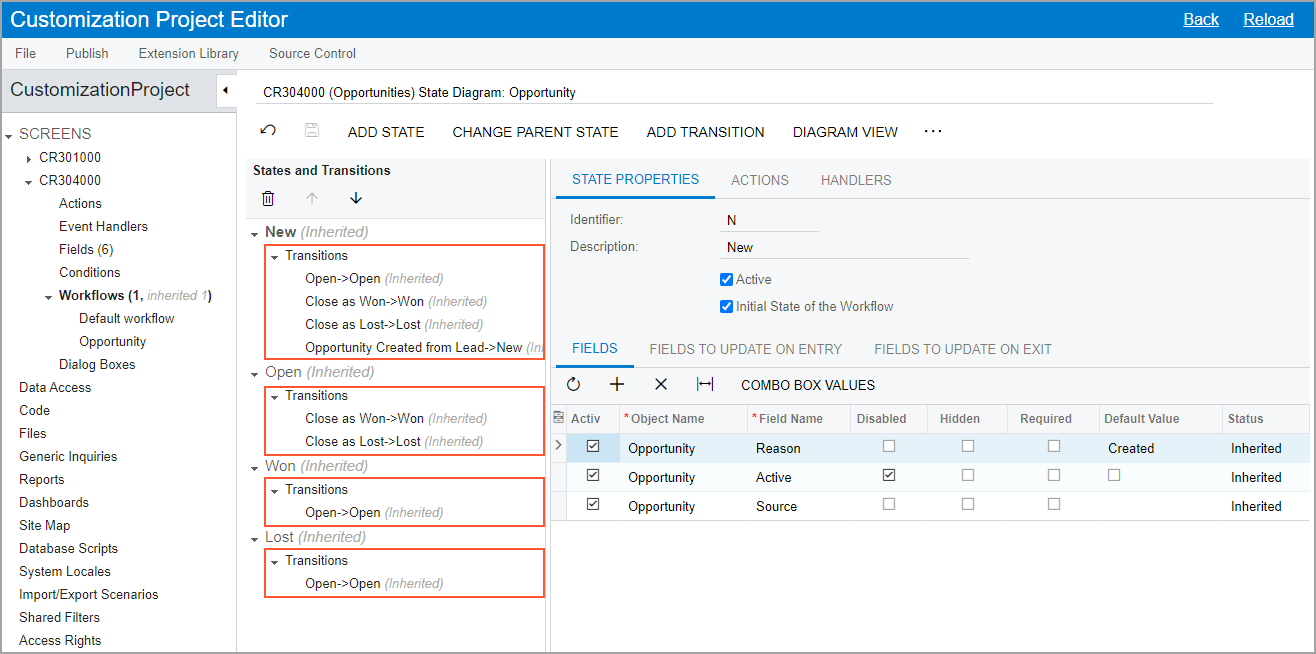 The following screenshot shows transitions on the States and Transitions pane for the opportunity workflow.