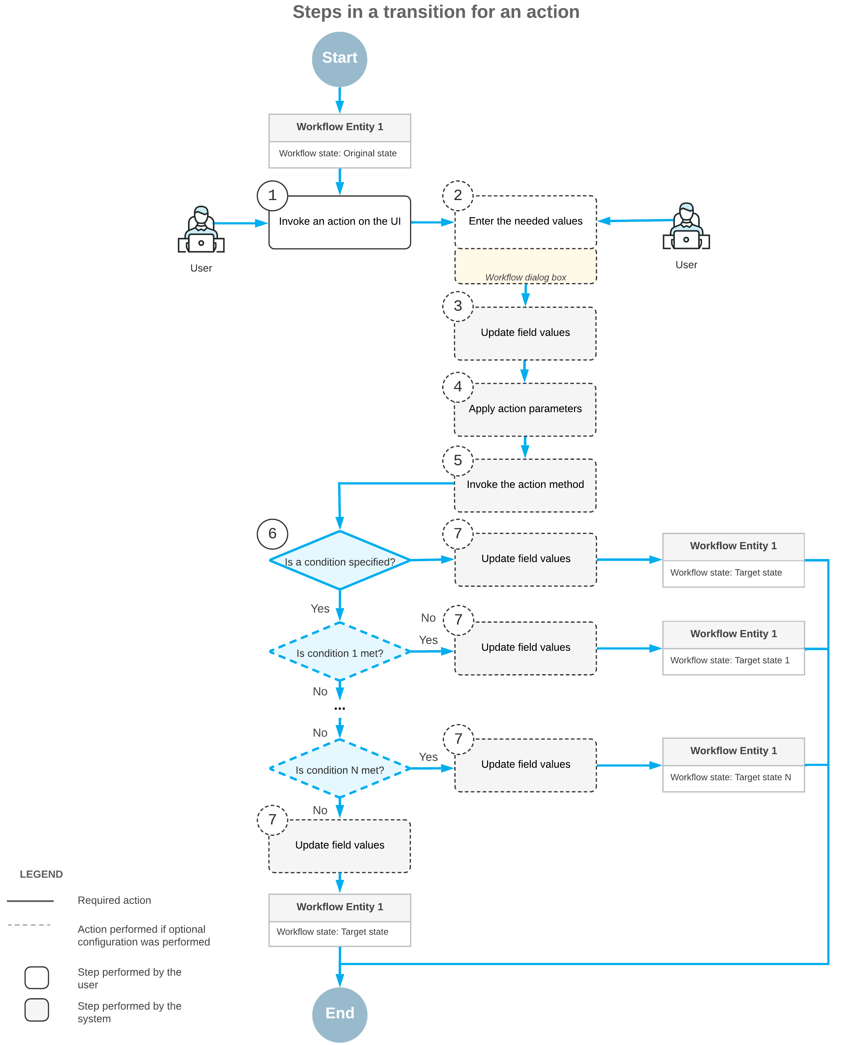 A transition in a workflow is triggered if a user performs a particular operation or a specific event is raised in the code. An event can be raised when some change occurs on the current form to the selected record or on another form to another record.