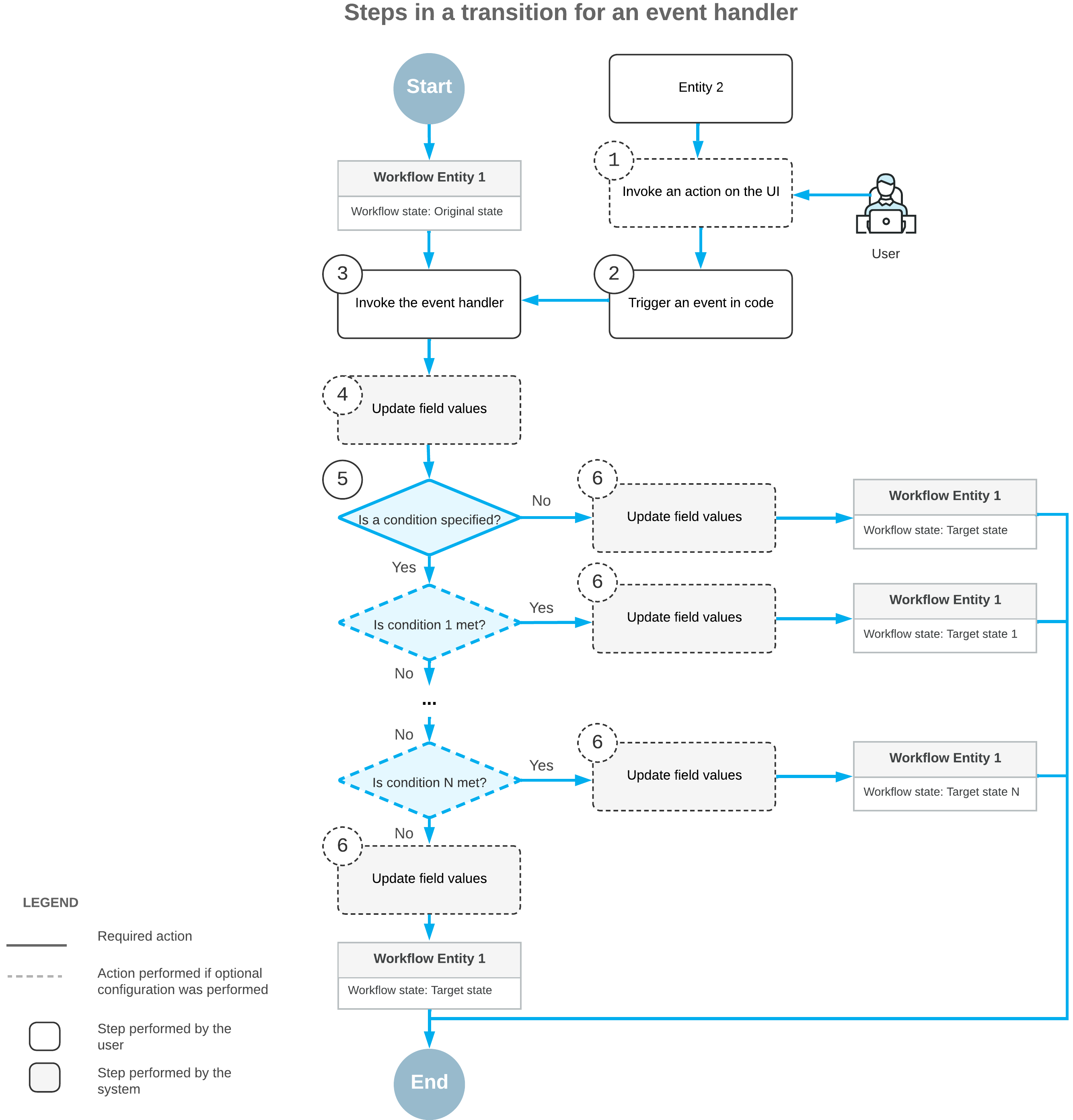 First, a user invokes an action in the UI of a different form for some other record (Item 1 in the diagram) or changes a value in a box on this form or another form. This triggers an event in the code (Item 2). Then the system invokes an event handler (Item 3) and updates any fields that you have specified for this event handler (Item 4). If you have specified a transition for this event handler and a condition for this transition, the condition is checked (Item 5).
