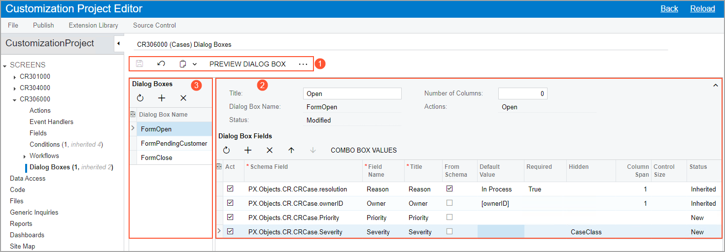 After you specify the needed settings for the dialog box, you can preview it by clicking Preview Dialog Box on the page toolbar or More menu of the page (see Item 1 in the following screenshot). The screenshot also shows the settings of the Details dialog box, which opens when a user opens a case on the Cases (CR306000) form (Item 2). Notice that the Dialog Boxes page also lists two more dialog boxes associated with the screen (Item 3). The first one opens when the user clicks Pending Customer; the second one opens when the user clicks Close.
