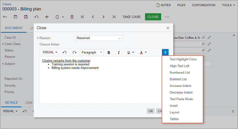 When the user clicks Close on the More menu (under Processing) on the Cases (CR306000) form to close a case, they can enter a comment in the text area. They can then use the buttons on the formatting toolbar to format the text and to insert images, links, and tables (see the following screenshot).