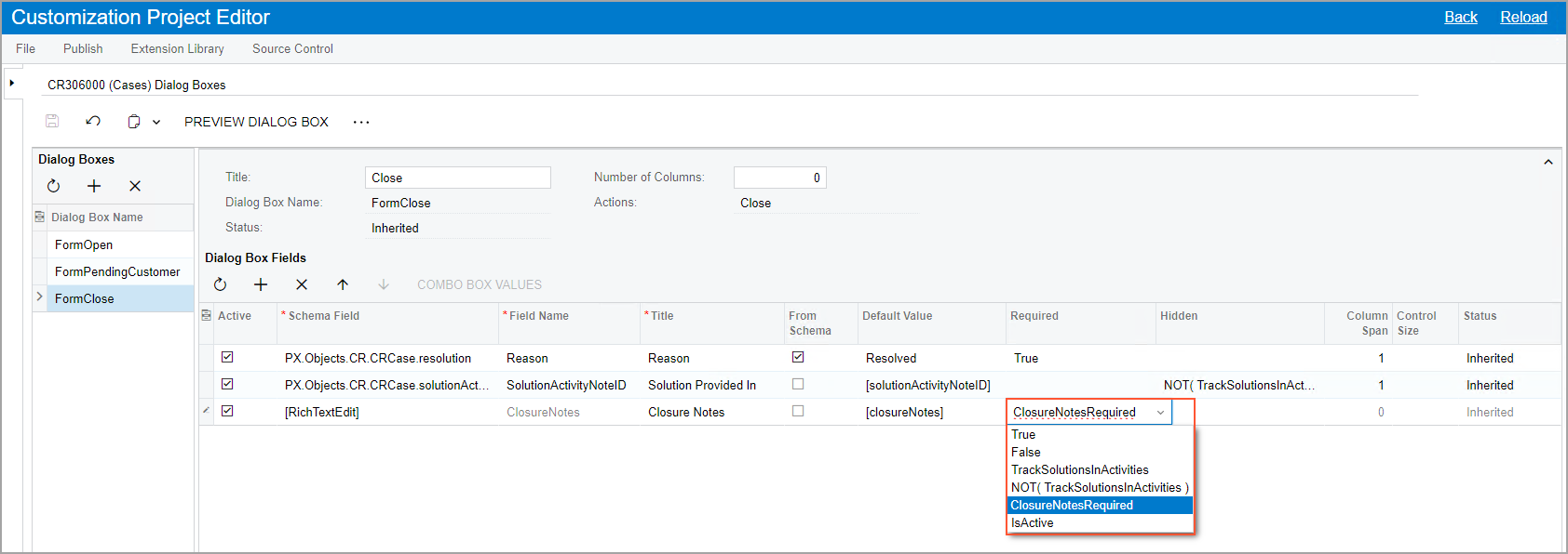 The following screenshot shows the selection of the ClosureNotesRequired condition for the Closure Notes field of the dialog box that the system displays when the user closes a case.