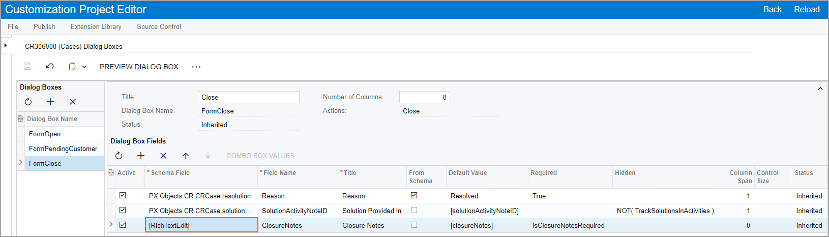 To add to a dialog box a field with rich text editor support, in the Dialog Box Fields table on the Dialog Boxes page, you select [[3]RichTextEdit; this is a standard name(?)2024/09/1120:11:33+02:00RichTextEdit] in the Schema Field column. The following screenshot shows the settings to add the ClosureNotes field (which corresponds to the box with the same name) to the dialog box that the system displays when the user closes a case.