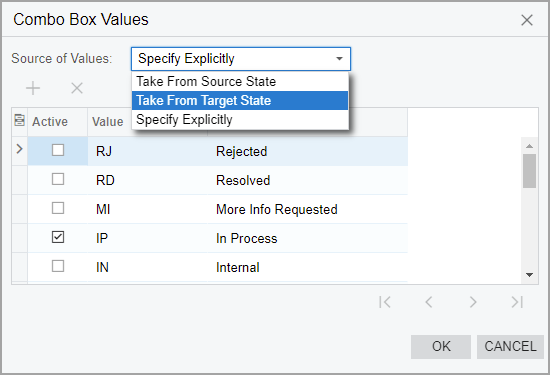 In a dialog box that the system displays when you invoke particular actions on a form, you can select the source of the values that will be available in a drop-down list. Instead of specifying drop-down values explicitly for multiple dialog boxes, you can indicate that these values should be the same as in the target state or source state of the transition. By using this functionality, you can use only one dialog box for all actions in a workflow.