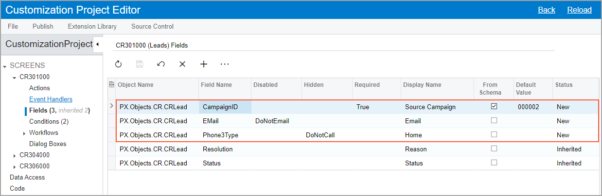 In the navigation pane of the Customization Project Editor, you open the Fields page by clicking Fields under the [2]form?2024/03/2618:35:24+01:00screen ID of the form for which you are modifying the field’s settings. The following screenshot shows the CR301000 (Leads) Fields page with the added CampaignID, EMail, and Phone3Type fields.