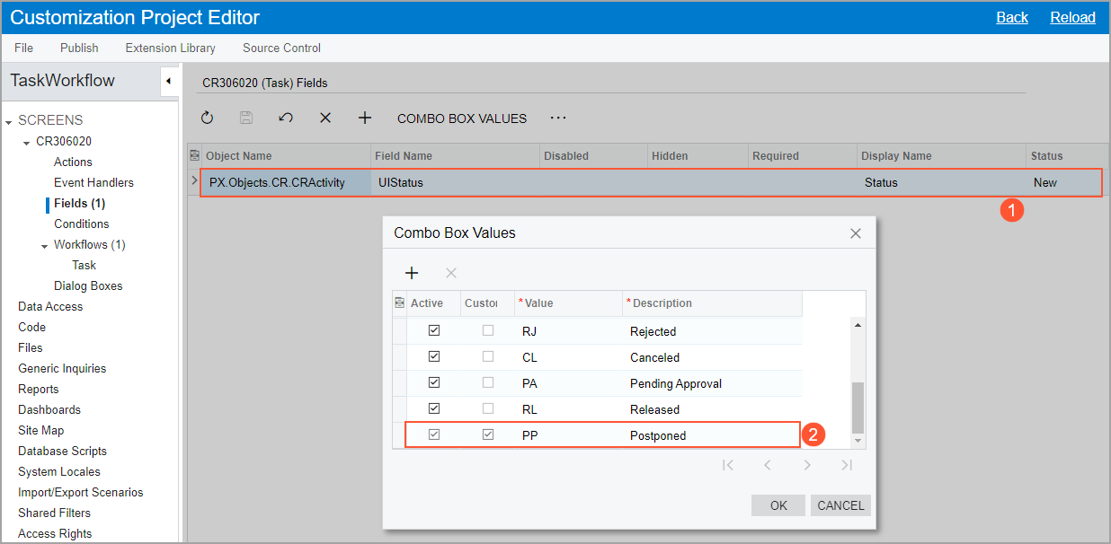 The CR306020 (Task) Fields page opens. Notice that the table contains a row with the UIStatus field, which is the state-identifying field specified for the screen on the Workflows page (see Item 1 in the screenshot below).