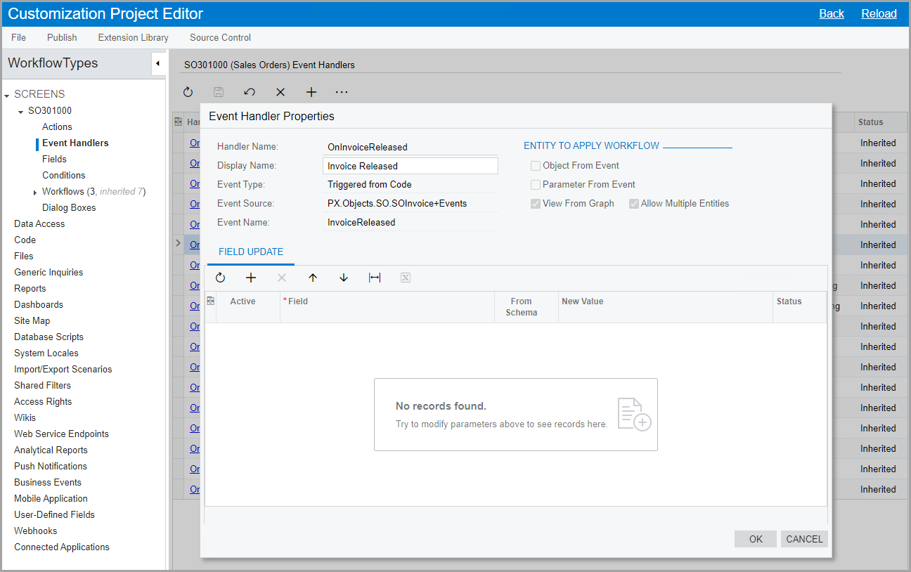 For both types of events, you can configure event handlers on the Event Handlers page of the Customization Project Editor, as described in the following sections, or in the code. For details on how to configure events and event handlers in the code, see Workflow Events: General Information[1]OR add information from the Framework guide? The Acumatica Framework provides its own event model in which events related to the manipulation of data records and data fields are raised in a particular order within certain scenarios. An event handler is a method invoked by the Acumatica Framework once the corresponding event is raised. By implementing event handlers, application developers can add business logic for the manipulation of data within business logic controllers (BLCs). This business logic includes the validation and calculation of field values, the management of data records (inserting, updating, or deleting), the checks for duplicate records, and the implementation of the presentation logic of the user interface.2023/02/1616:15:27+03:00.