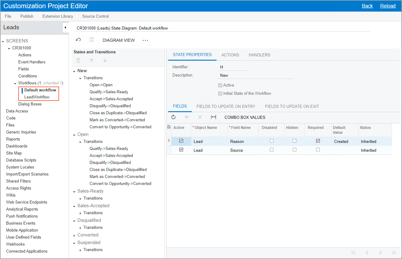 For each inherited workflow that you create, the system adds a node for the page under the Workflows node. The following screenshot shows the nodes of the workflows for the Leads (CR301000) form: the predefined workflow (Default workflow) and the inherited workflow (LeadWorkflow).