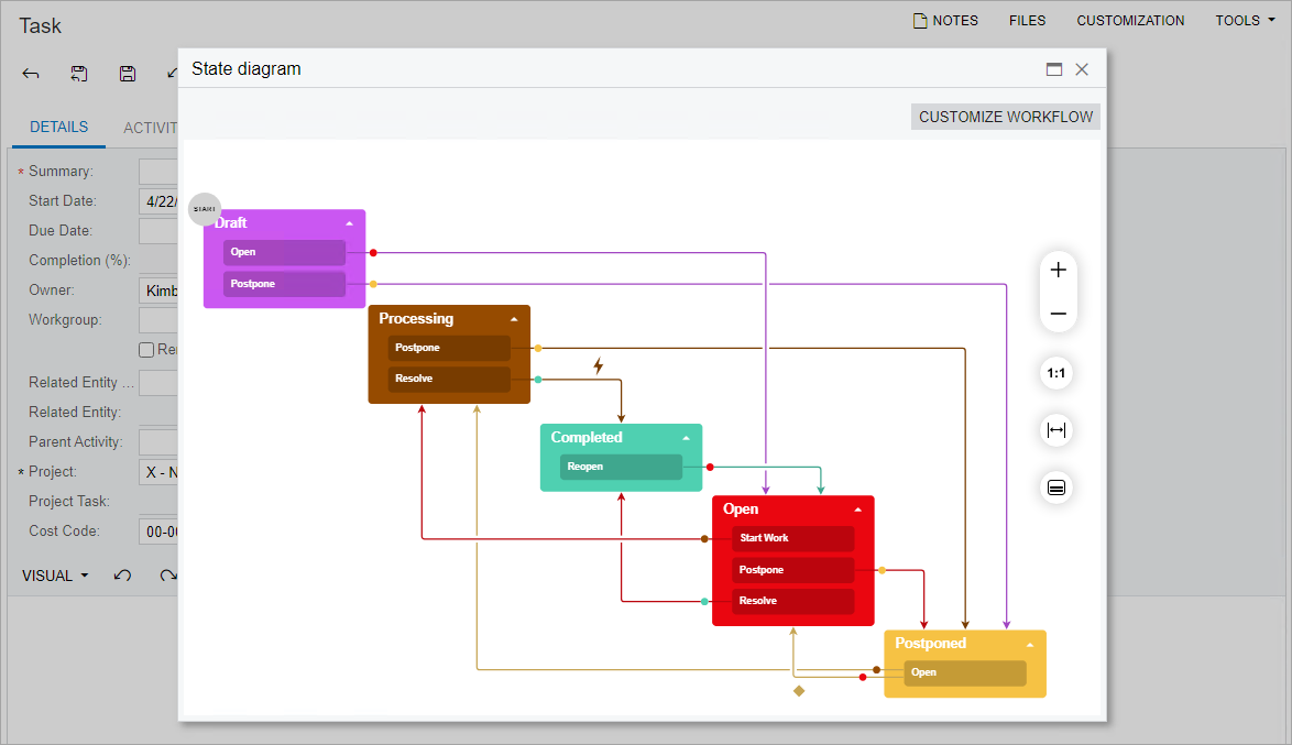 - On the Customization Projects (SM204505) form, click the TaskWorkflow project name to open the customization project.