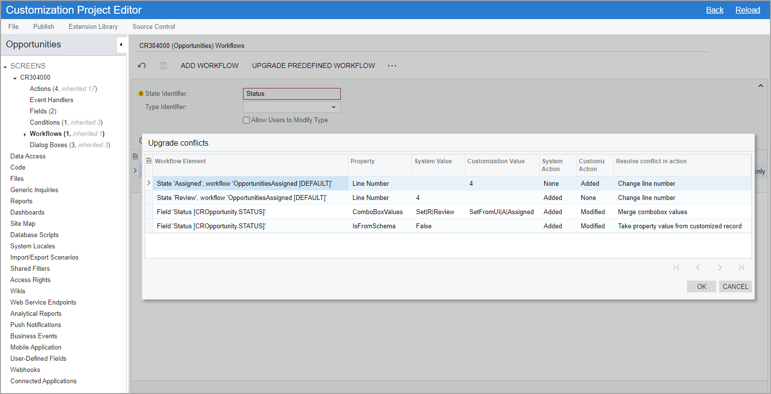 By using the Customization Projects (SM204505) form, you will upgrade the version of the predefined workflow of the Opportunities (CR304000) form in the Opportunities customization project.