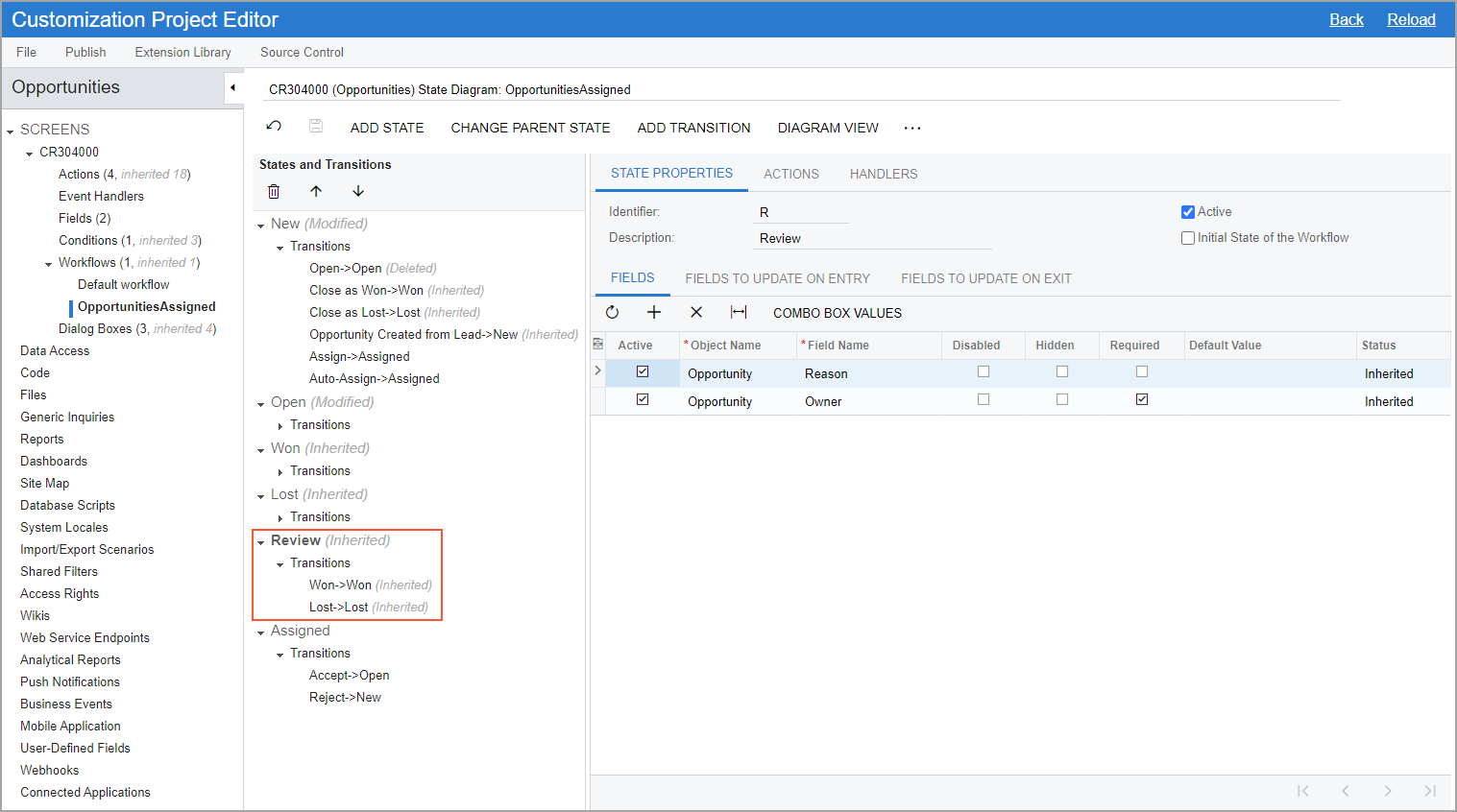 The CR304000 (Opportunities) State Diagram: OpportunitiesAssigned page opens. The customized workflow should look as shown in the following screenshot. Notice that the