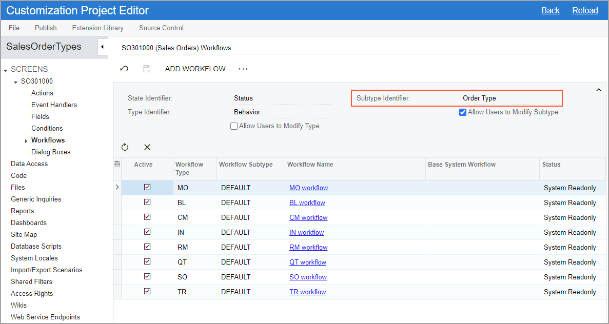 [3]I know I have made this point before, but it is problematic that we did not define what the second-level identifiers are, and we are just getting around to illustrating it--but even here, we are doing so only through an example. This would be sufficient if we had already explained what workflow identifiers of the second level are, but we had not.lfy_h5k_syb2023/08/3117:16:05-04:00TBD4lfy_h5k_syb42023/09/0814:04:45+03:00On the Order Types (SO201000) form, you can create multiple order types that are based on the same automation behavior. Without the use of workflow identifiers of the second level, on the Workflows page, you cannot create separate workflows for these custom order types, because for a particular order type, the system uses the workflow of the automation behavior this order type is based on.