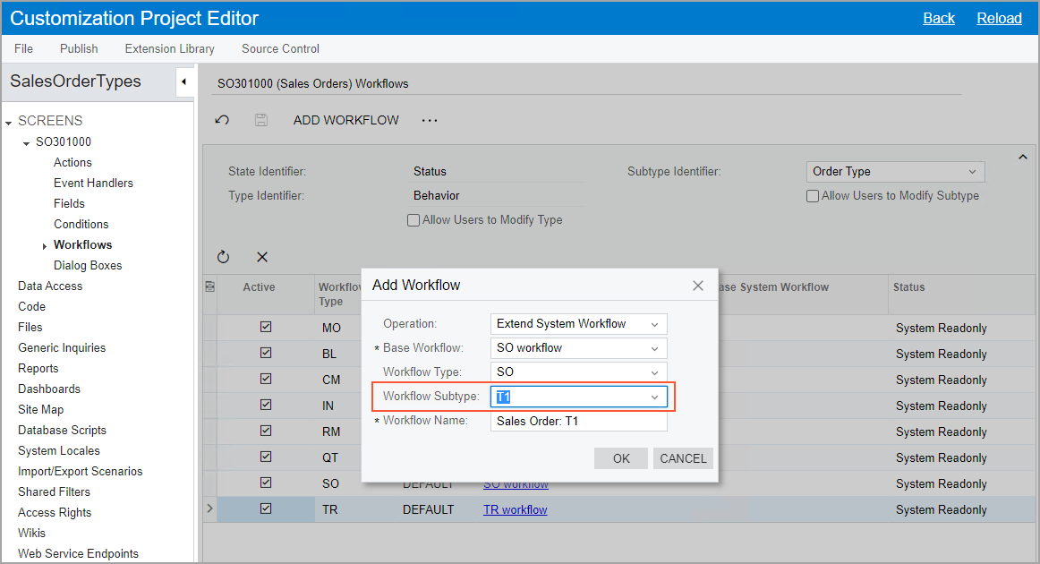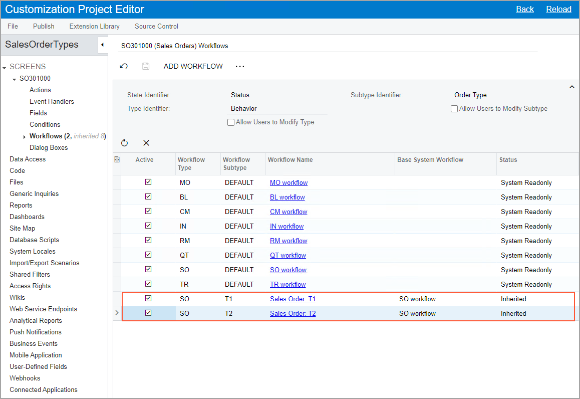 Suppose that on the Order Types (SO201000) form, you have created two custom order types (T1 and T2) that are based on the Sales Order automation behavior. For each form that has a workflow-identifying field specified in the predefined system workflow, as is the case with the Sales Orders (SO303000) form, the system displays a workflow-identifying field of the second level on the Workflows page (the Order Type field in the following screenshot).