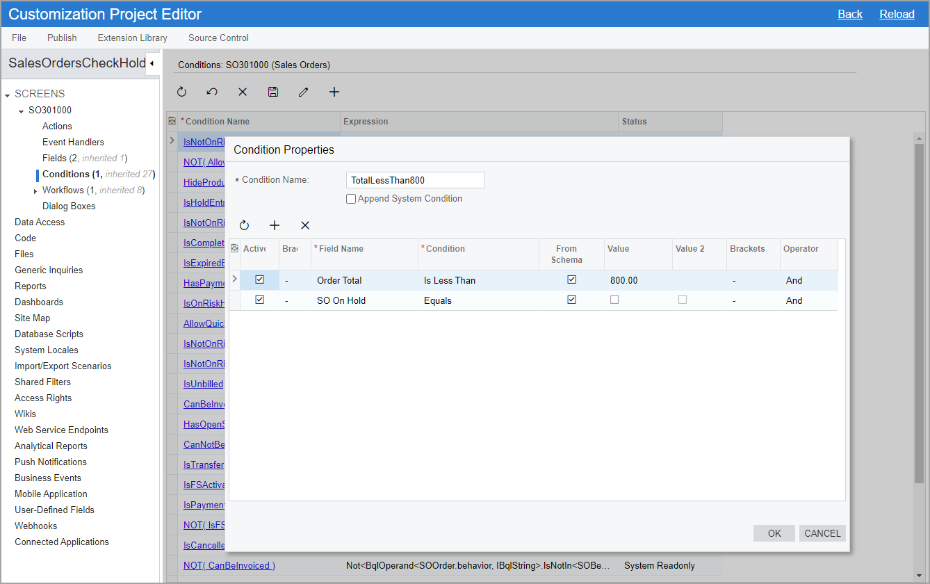 In this step, you will add conditions to be used for SO sales orders in the SalesOrdersCheckHold customization project. In the Customization Project Editor for this customization project, perform the following instructions: