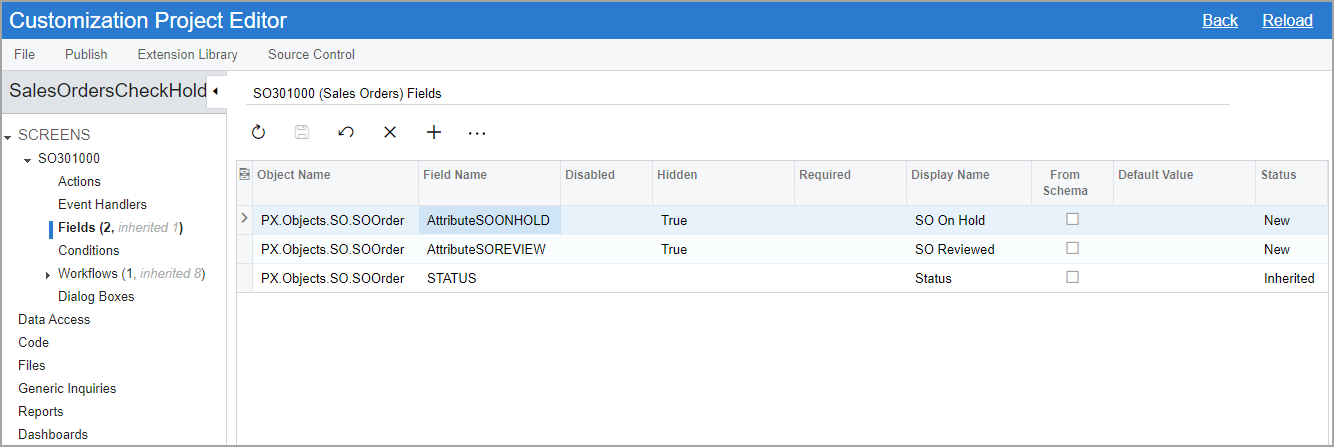 To add the user-defined fields to the workflow and hide them on the Sales Orders (SO301000) form, in the Customization Project Editor for the SalesOrdersCheckHold customization project, perform the following instructions: