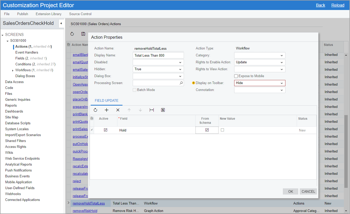 On Holdstate and is now listed in the States and Transitions pane below the other transitions from this state. Also notice that on the Actions tab of theOn Holdstate, theTotal Less Than 800action that you have created is added to the table below the other actions of this state. - Save your changes.