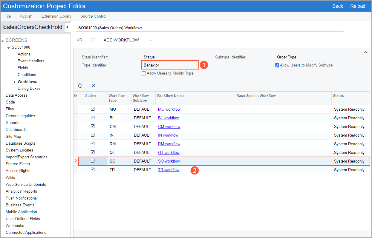 The Sales Orders (SO301000) form provides workflows for multiple types of documents, such as sales orders, invoices, and credit memos. A separate workflow type is used for each of these documents. The type of the workflow is identified by the value of the Behavior internal field, which is unavailable on the form. (You can learn the field that is used as the workflow-identifying field for the form by reviewing the value of the Type Identifier box on the Workflows page that is open for the form, as Item 1 in the following screenshot shows.) For sales orders, the Behavior field has the SO value, which is the type of the workflow for sales orders, as you can see on the Workflows page (Item 2).