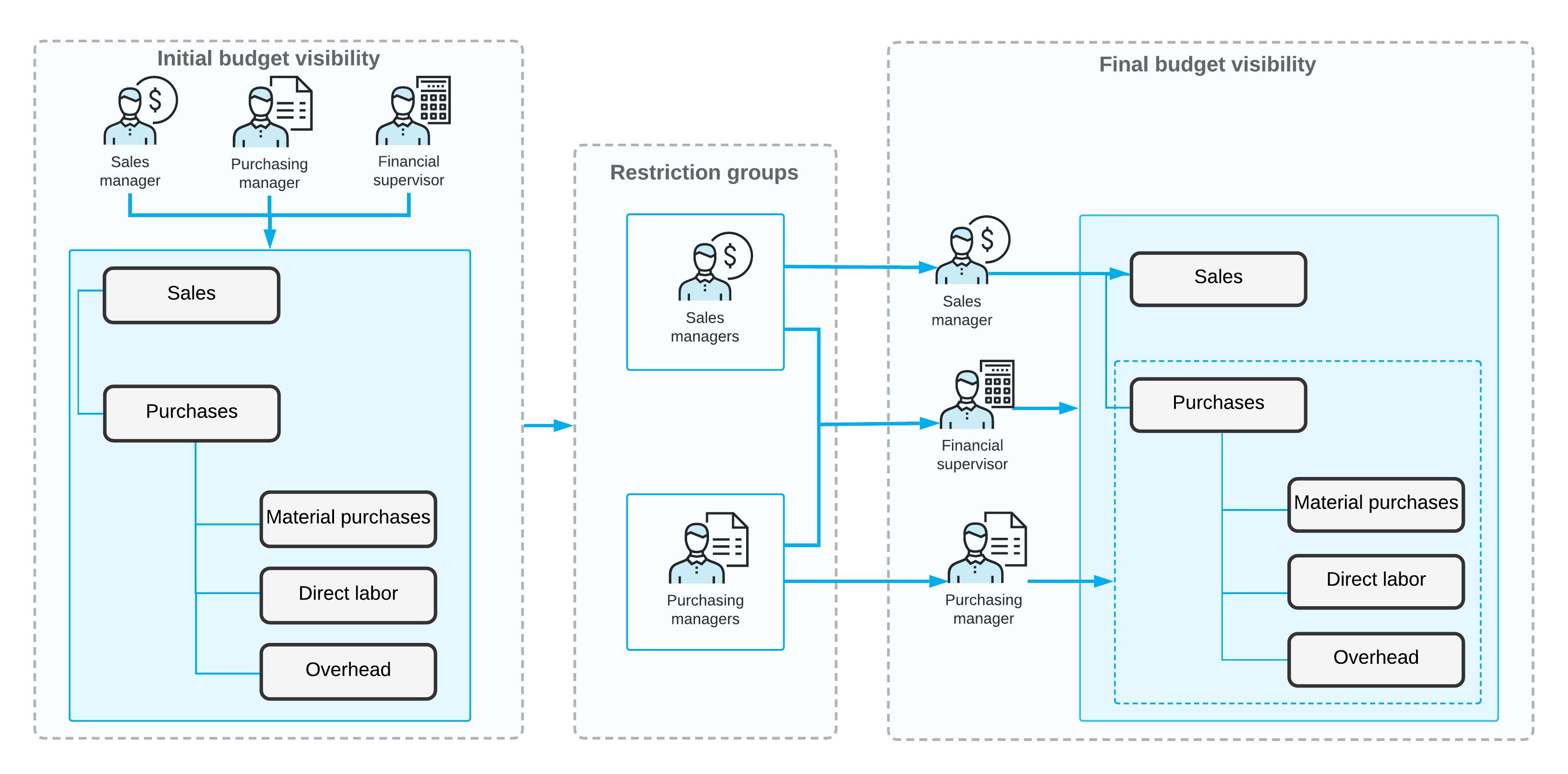 In the diagram, the budget node was initially visible to all users assigned to the Sales Manager, Purchasing Manager, and Financial Supervisor roles. By setting up a restriction group with direct restriction, you make the Sales node of the budget tree visible to the users with the Sales Manager role, and the subnodes of the Purchases node visible to users with the Purchasing Manager role. The Financial Supervisor has been included in both groups, so users with this role can access all nodes of the budget tree.