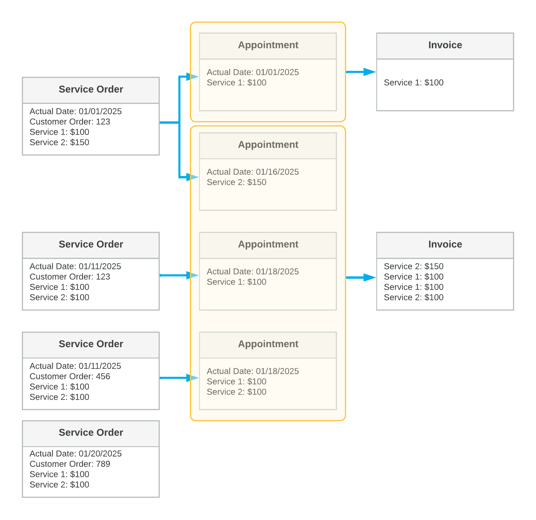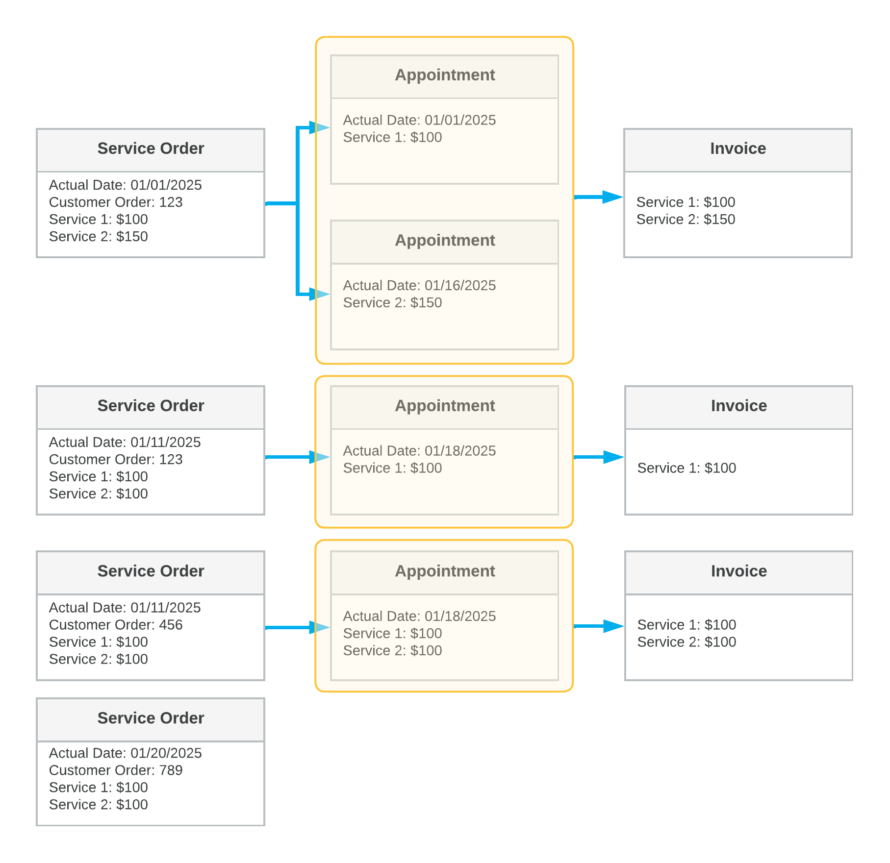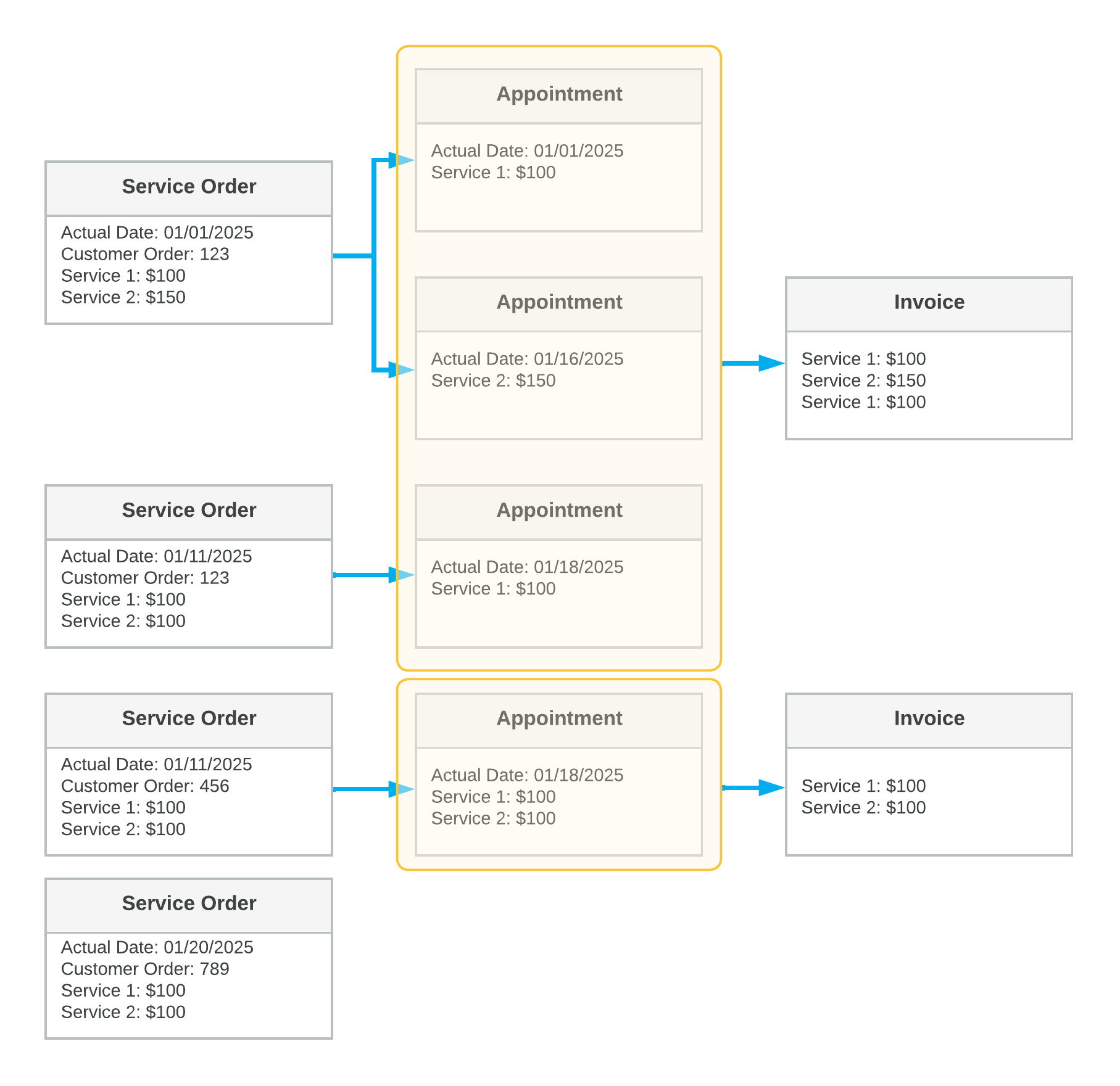 In the diagram, you can see the details and key settings of the following: the service orders (in the first column), the appointments (in the second column), and the generated billing documents (in the third column). Each yellow box shows the grouping of the documents included in the generated billing documents.