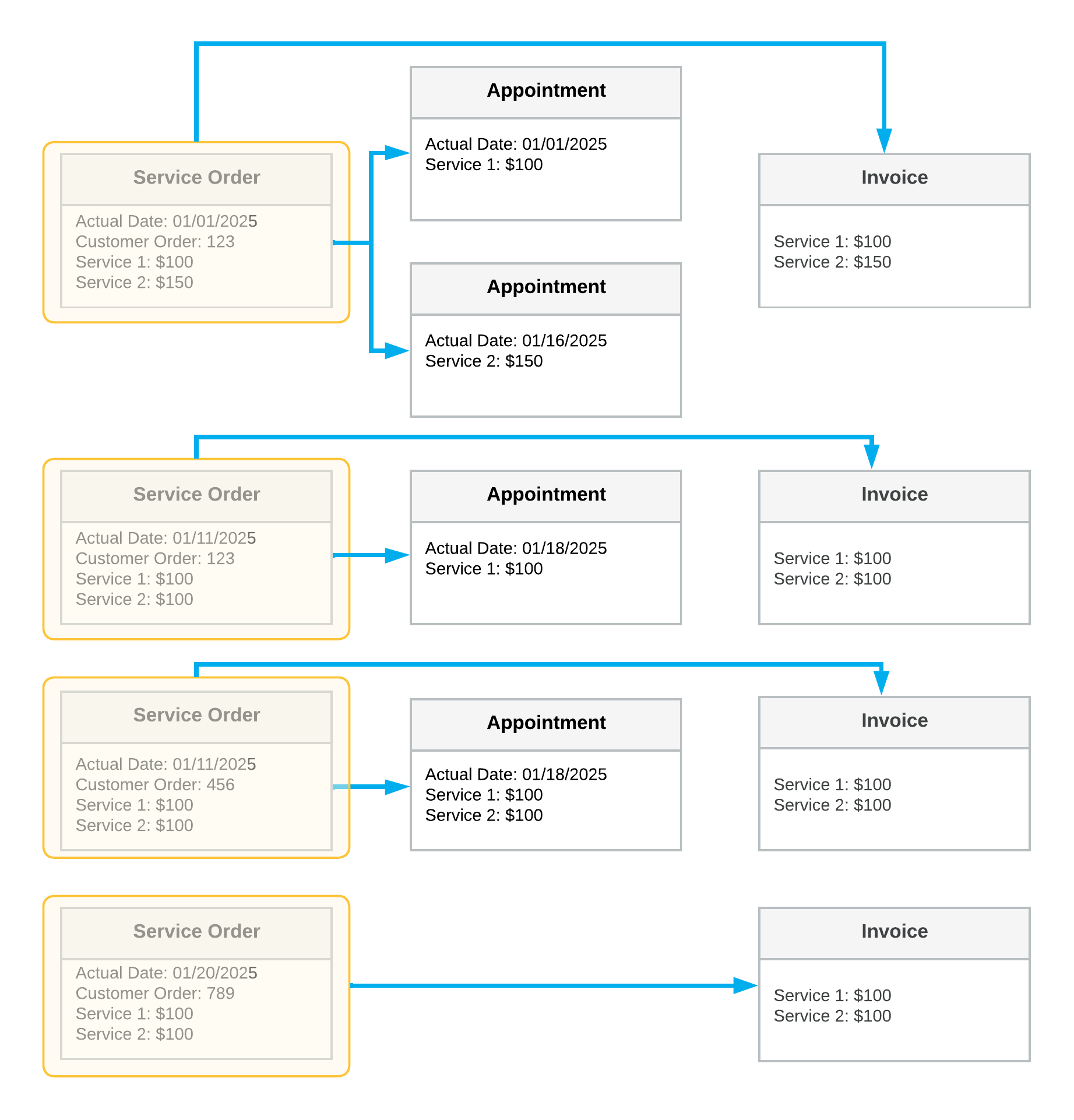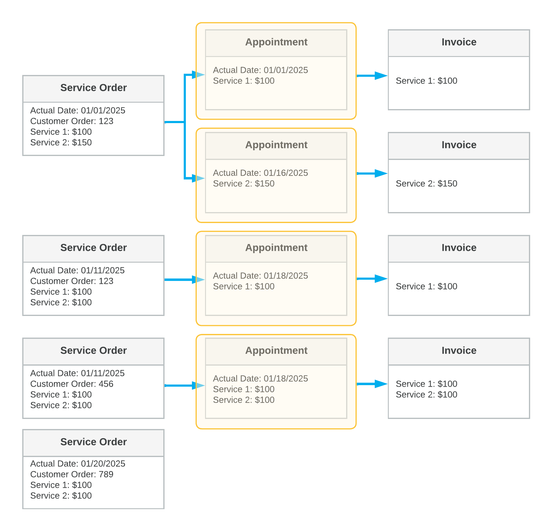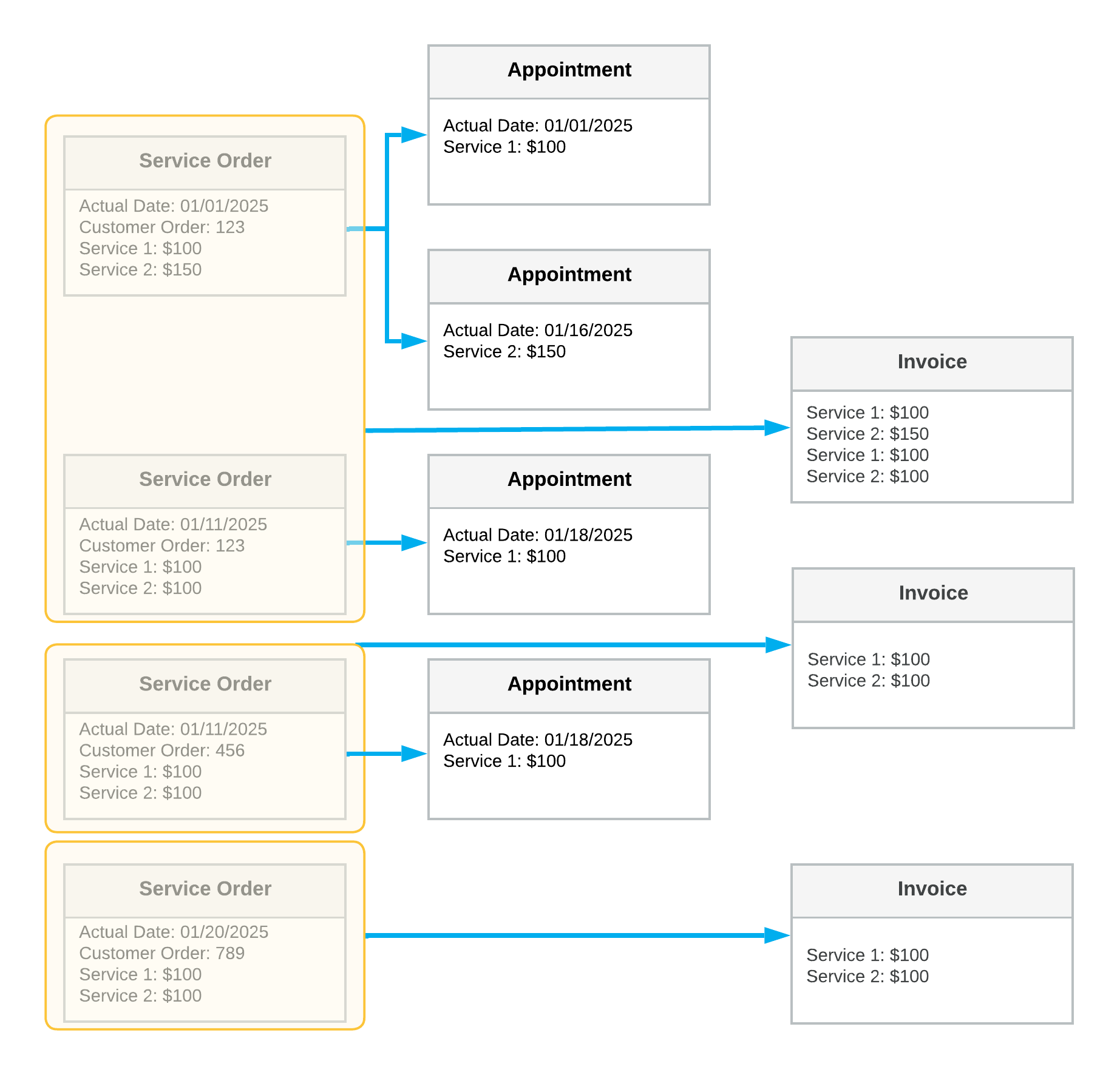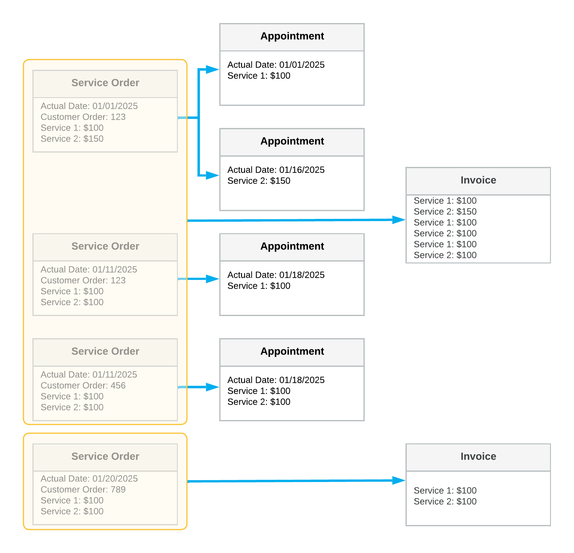 In the diagram, you can see the details and key settings of the following: the service orders (in the first column), the appointments (in the second column), and the generated billing documents (in the third column). Each yellow box shows the grouping of the documents included in the generated billing documents.