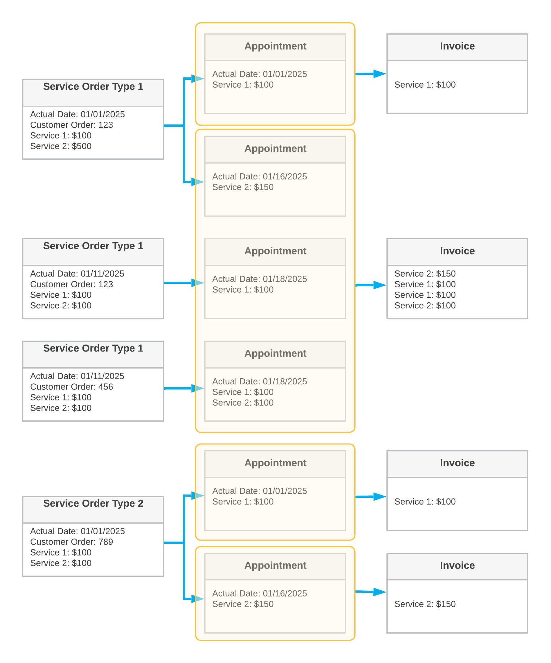 The following diagram shows the details of the service orders of different service order types created for one customer (in the first column). You can also see the details of the appointments (in the second column) and the billing documents generated based on the settings of the billing cycles. Each yellow box shows the grouping of the documents included in the generated invoices.