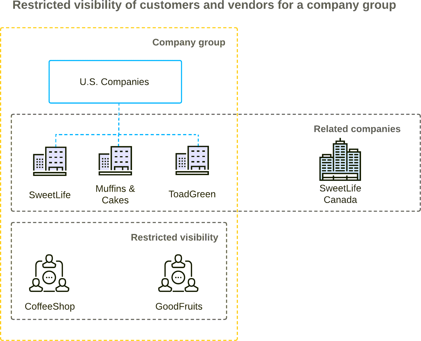 In the diagram, three of the related companies are included in the same company group and the visibility of the CoffeeShop customer and the GoodFruits vendor has been restricted to this company group. Thus, the CoffeeShop and GoodFruits vendors can be used only in the documents having the SweetLife, Muffins & Cakes, or ToadGreen branch as the original branch of the document. Only the users that are included in the access roles associated with the SweetLife, Muffins & Cakes, or ToadGreen branch can view and edit the CoffeeShop record on the Customers (AR303000) form and the GoodFruits record on the Vendors (AP303000) form. That is, only the users belonging to the access roles specified for the SweetLife, Muffins & Cakes, or ToadGreen branch can create documents for this customer and vendor and view and edit the customer or vendor's records (if the users have the appropriate rights on the needed forms).