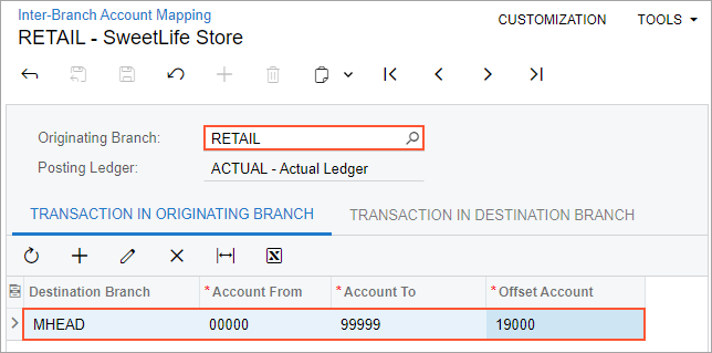 In the first row on this tab, notice that the MRETAIL branch is selected as the destination branch. This mapping rule applies to all the accounts within the specified account range. The 19000 - Due from Related Entity account is specified as the offset account to which the system will post the balancing entry in the originating branch. [2]OA: Can we delete this rule and leave only interbranch mapping?2021/05/1715:02:42+03:00The same settings apply to the HEADOFFICE branch in the second row of the tab.