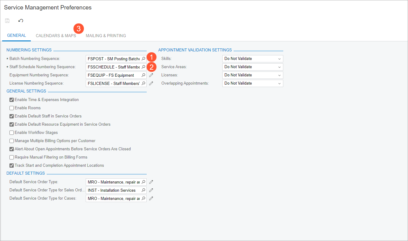 - On the Service Management Preferences (FS100100) form, you will ensure that the numbering sequences and the work calendar are specified.