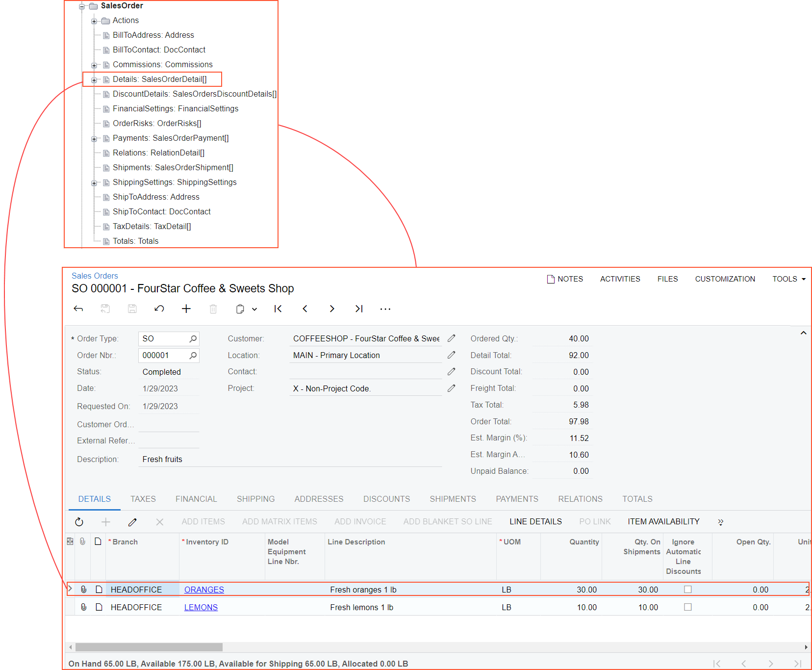 corresponds to a detail line on the Details tab of the Sales Orders (SO301000) form, as shown in the