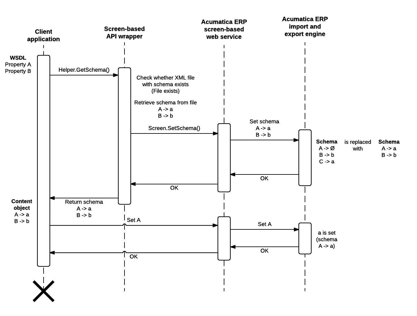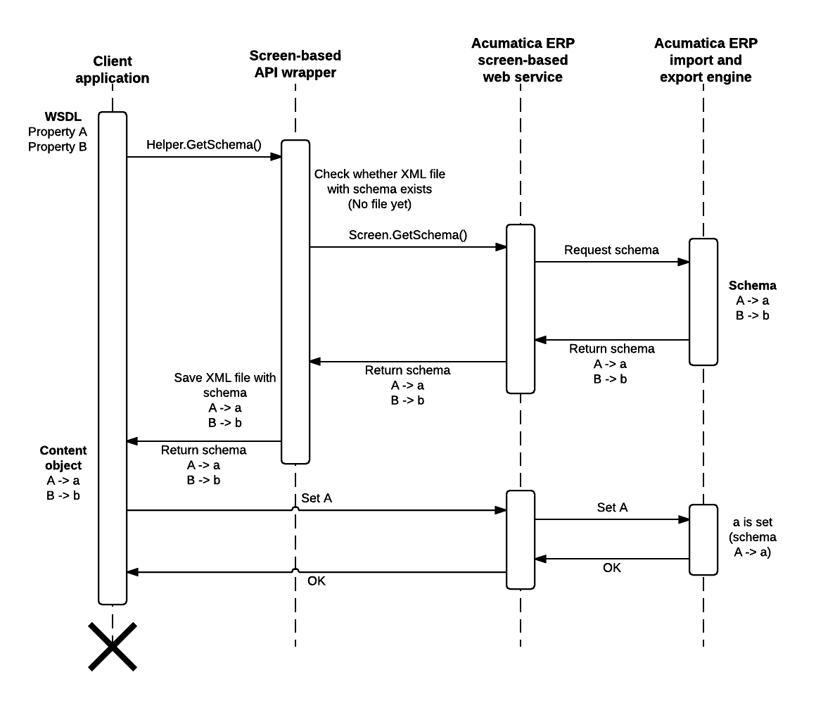 When the client application is executed for the second time and all subsequent times and it requests the schema of an MYOB Acumatica form by using the Helper.GetSchema() method, the wrapper retrieves the XML schema that is saved locally and submits this schema to the MYOB Acumatica screen-based web service by using the Screen.SetSchema() method of the screen-based API. The web service interacts with the MYOB Acumatica import and export engine, which replaces the current schema of the form that is stored on the server with the one that was saved locally. The wrapper returns the schema that was saved locally to the client application. The client application uses the local schema to work with MYOB Acumatica.