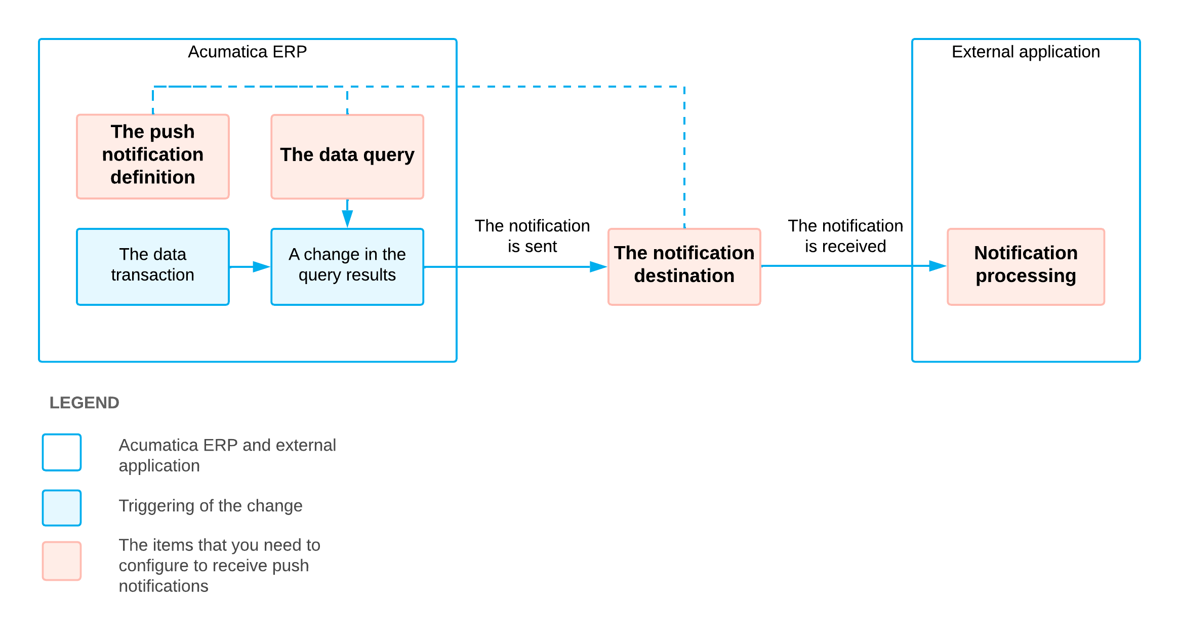 - The definition of the push notification in MYOB Acumatica, which specifies the data query and the notification destination