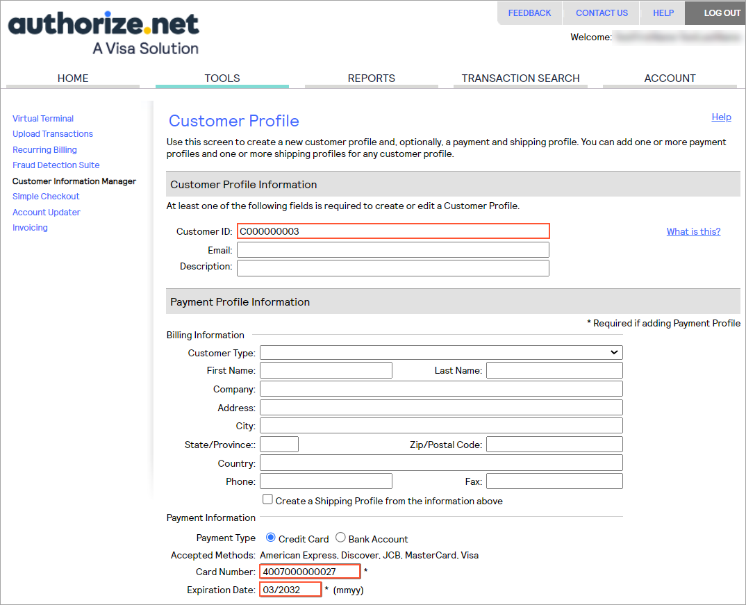 - In the Customer Information Manager tool of Authorize.Net on https://sandbox.authorize.net/, add a new customer profile. In the