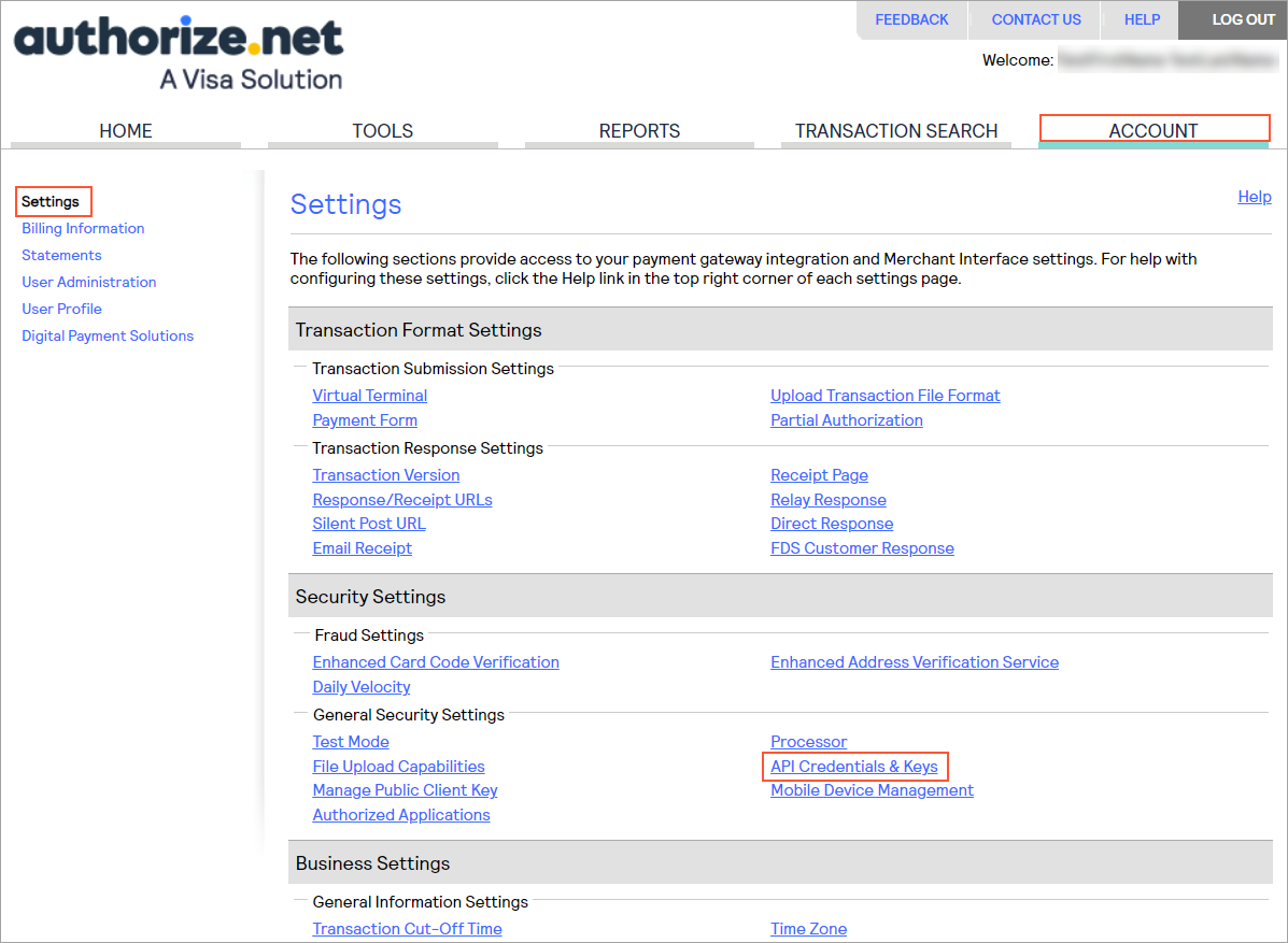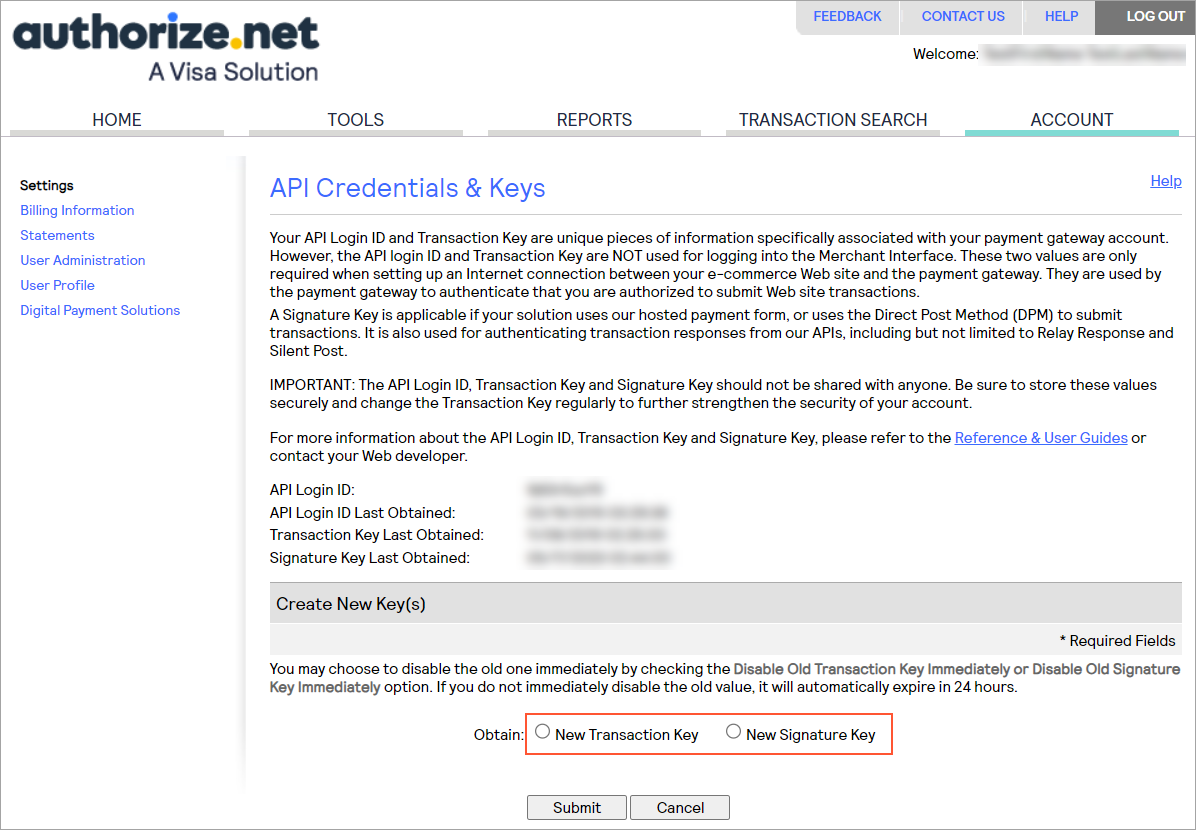 After you create this account, you will get the credentials to be used in payment processing (that is, the API login ID and transaction key). After these credentials are generated, you can view the API login ID and generate a new transaction key and signature key on the API Credentials & Keys page of your account on https://sandbox.authorize.net/. (You go to this page as follows: ; see the following screenshots.)