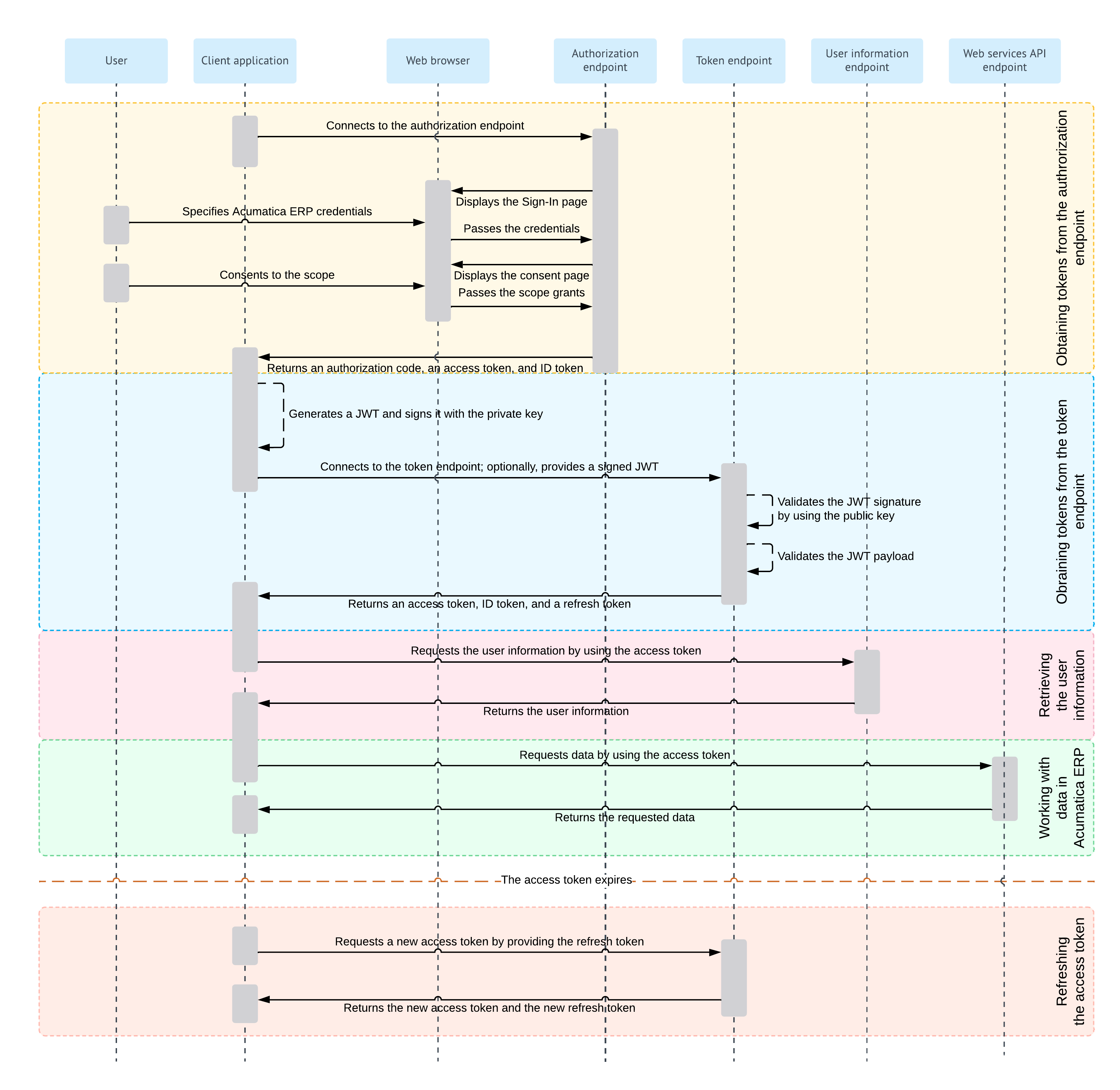 The client application requests data from MYOB Acumatica and provides the access token with this request. MYOB Acumatica returns the requested data. For details on this process, see OAuth 2.0 and OIDC: Working with Data in MYOB Acumatica.