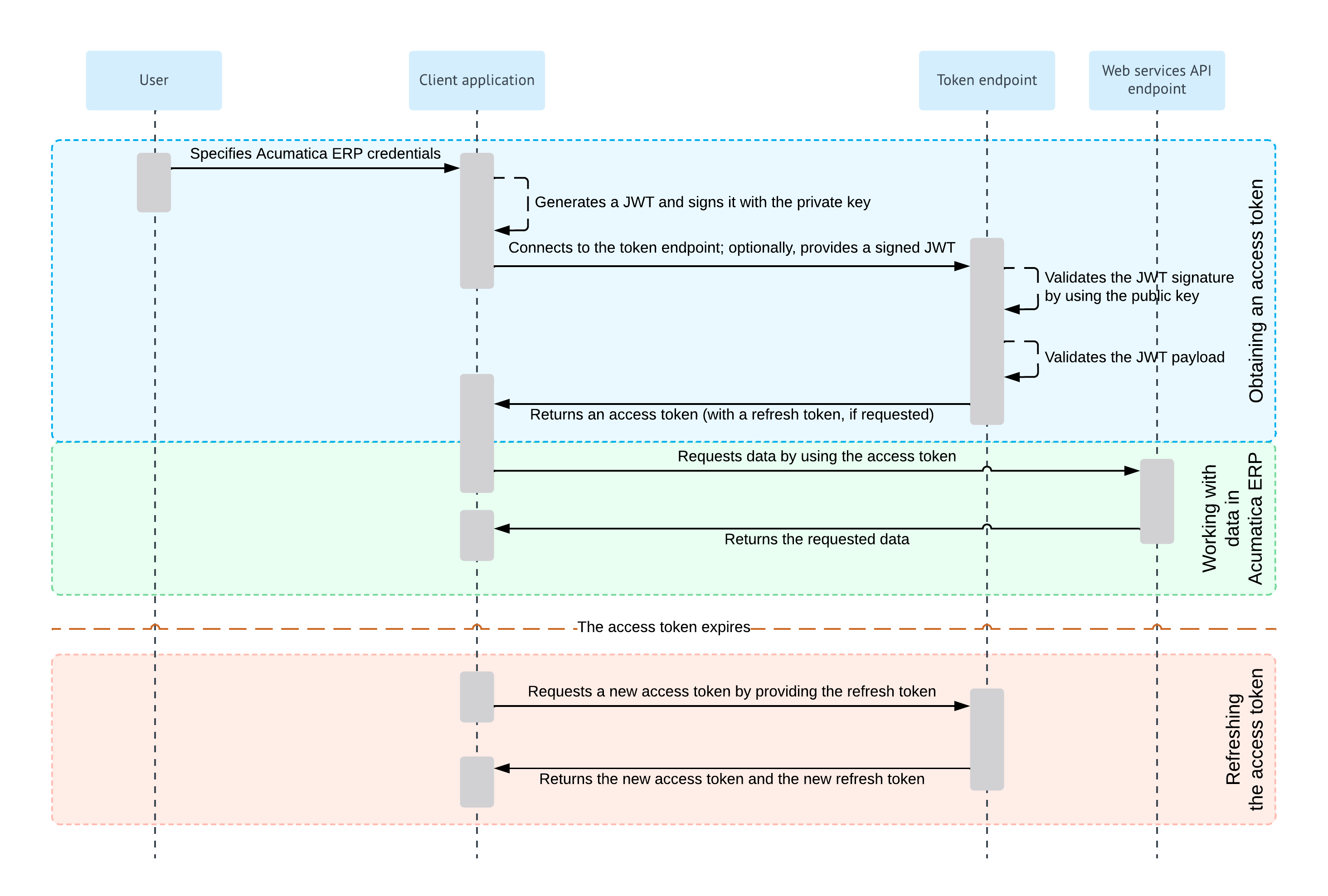 With the Resource Owner Password Credentials flow, the credentials (username and password) of the MYOB Acumatica user are provided directly to the client application, which uses the credentials to obtain the access token. When the access token expires, the client application can request a new access token by providing a refresh token.