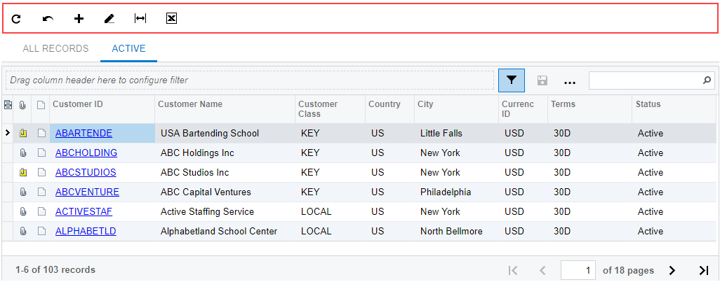 Each table on an MYOB Acumatica form, tab, dialog box, or page has a table toolbar, which contains the buttons you can use to work with the details or objects of the table. A toolbar, shown in the following screenshot, includes buttons that are specific to the table, standard buttons that most table toolbars have, and the search box (for some tables; for others, the search box is displayed in the filtering area).