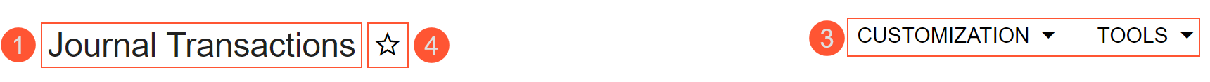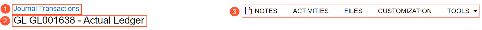 - Form name button (Item 1). You can click it to return to the list of records, which in the example above is Journal Transactions (GL3010PL).