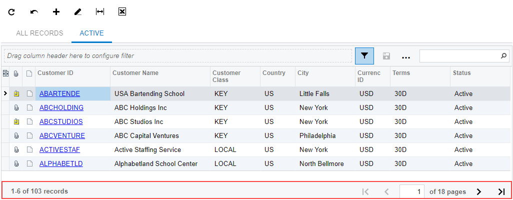A table on an MYOB Acumatica form, tab, or dialog box can have a table footer, which contains buttons you can click to navigate between the pages of the table. The toolbar footer displays navigation buttons if the table has too many details or objects (that is, table rows) to fit on one page. For a generic inquiry form (such as a substitute form for a data entry form), the table footer also displays the number of pages and the total number of records, as shown in the following screenshot.