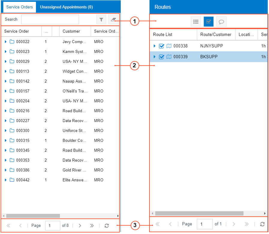The following screenshot show examples of tables and their toolbars. The left table shows a list of service orders (which spans multiple pages, as the table footer illustrates), and the right lists routes.