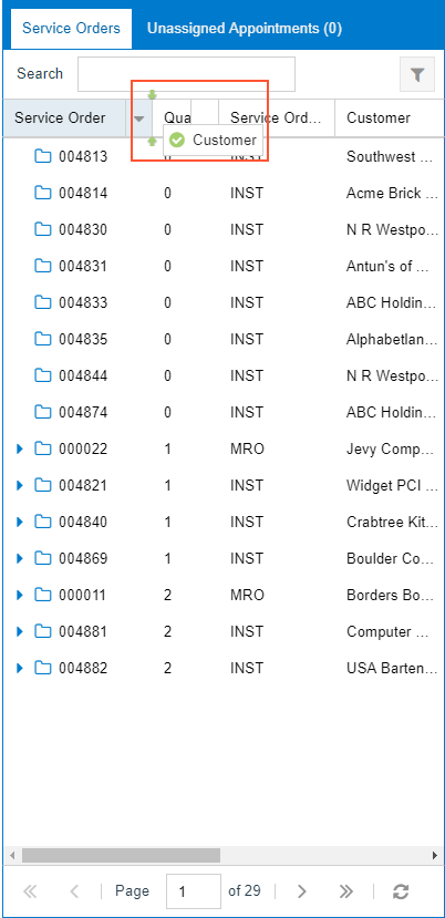 Tabs and panes on the calendar boards and maps contain tables on the calendar boards and maps display relevant objects or details in each row and a key setting of the object or detail in each column. The forms provide interaction between the tables and the calendar or map (such as when a service order is dragged to the appropriate day and time on the calendar).