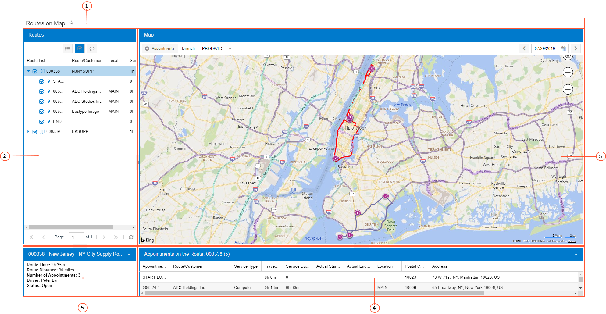 This pane displays the list of appointments for a particular branch and a particular day, grouped by the staff member assigned to them or grouped by the route execution they are related to.
