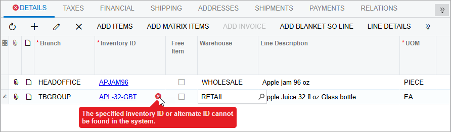 In Modern UI, when there is an error or warning message related to a table value, the system displays an error or warning icon next to the tab name and beside the cell containing the incorrect value; it also highlights the entire row with the error. To view the description of the error or warning, you hover over the icon or the highlighted row. (See the second screenshot below.)