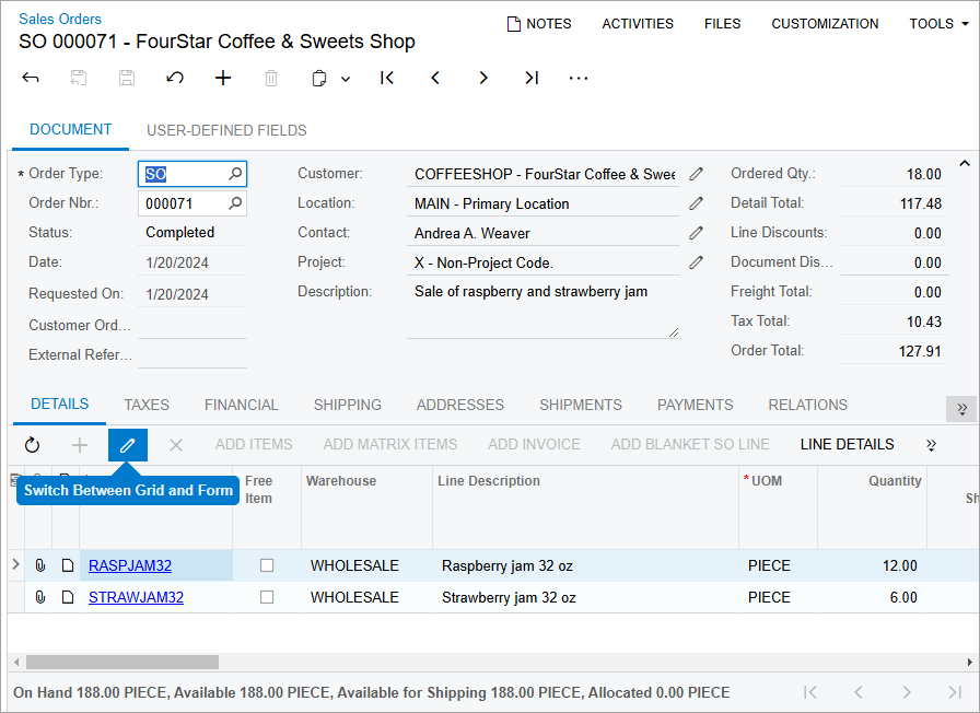 For some tables, in the Classic UI, you can switch between a grid view and form view of the data, as shown in the following screenshot. The grid view is a standard table view, with all details arranged in a table and each row representing one detail. The form view shows a set of elements intended for only one detail or document row, and you use the navigation buttons to move to a different detail.