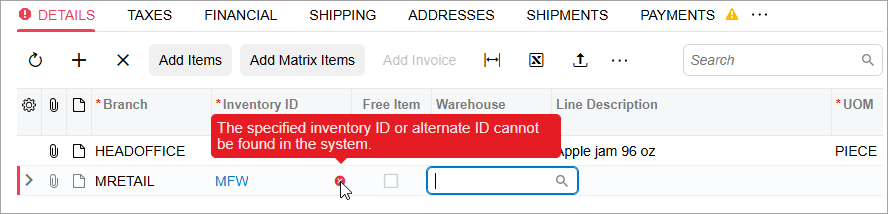 In the Classic UI, MYOB Acumatica displays errors, warnings, and some informational messages by using the browser's modal dialog boxes. The Modern UI displays these messages in the form's upper-right corner. (See the following screenshots.)