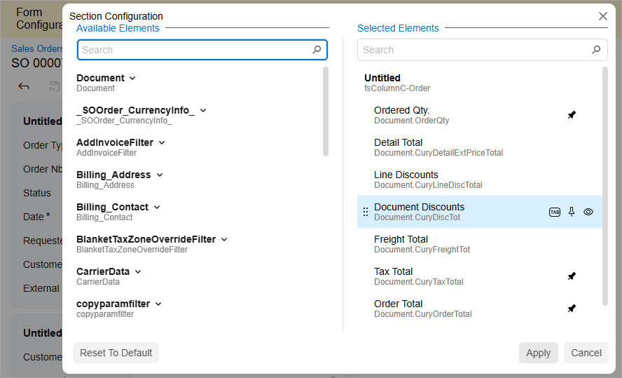 - To change whether the UI element should be displayed when the fieldset is collapsed, hover over the element name in the Selected Elements pane and click Pin.
