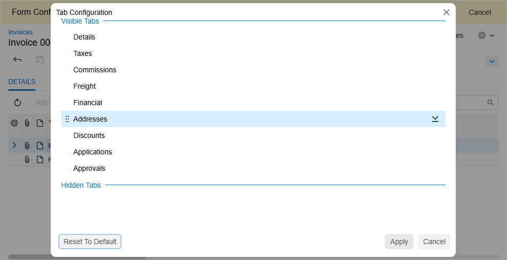 In Form Configuration mode, you can change the order of tabs and hide or display individual tabs. Changes to the tab controls will be applied to form layout shared among all users.