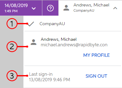 The Tenants section of the User menu contains the list of tenants to which you can sign in if multiple tenants are configured in your MYOB Acumatica instance. The tenant you are currently signed in to is indicated with a check mark. You can switch to a different tenant by clicking the tenant name. For more information on the configuration of multiple tenants, see Tenants: General Information in the MYOB Acumatica System Administration Guide.