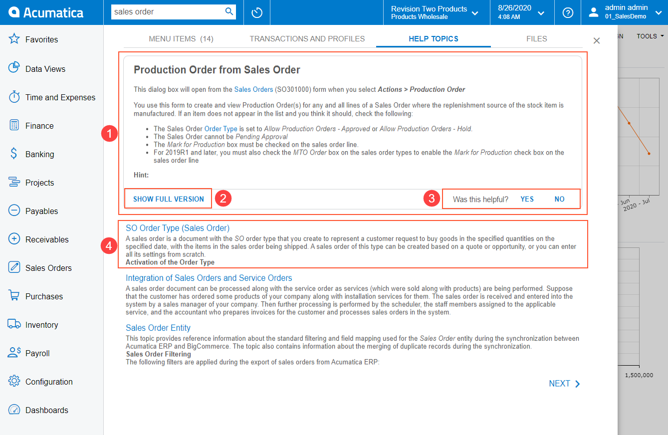 Unlike built-in Help topics, online Help topics are regularly updated to the latest version of MYOB Acumatica, and online Help contains the newest topics. The search functionality in online Help also takes into account the relevance of topics to the search term. If the system has been configured to use the online Help functionality, users can get the most relevant search results from the Online Help Portal, which is the open source of Help topics.