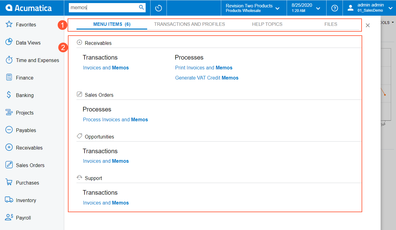 - Transactions and Profiles: On this tab, you can look for specific system records, such as customers, vendors, prospects, employee accounts, and notes attached to records.